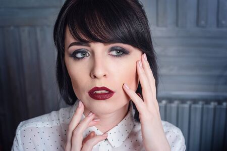 Close-up of young attractive woman with ideal skin and red lips posing indoor.