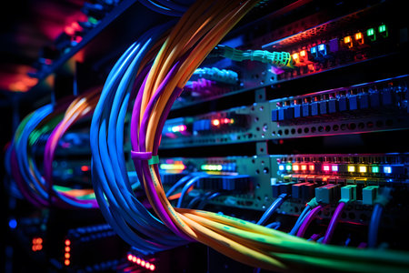 A high efficiency fiber optic network cables glowing server rack with colorful led light ambience, dynamic connectivity feeling