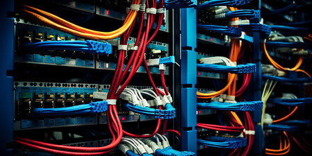 Close-up of network server with ethernet cables and led indicators. That the image is generated using AI.