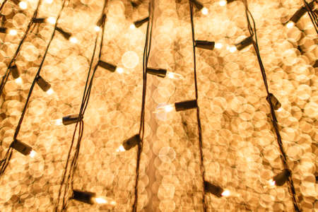 Defocused glittering background of golden garland christmas lights. Abstract blurry bokeh backdrop. Holiday concept