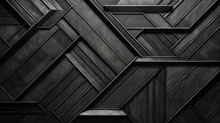 Dynamic interplay of geometric shapes characterized by black, white, and dark gray tones. Features triangular and polygonal forms creating texture and depth in an abstract design.