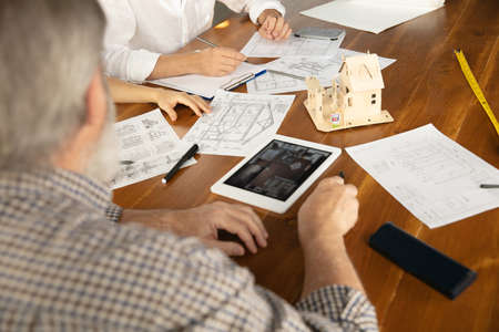Close up hands of architect-engineer and young couple during presentation of future house. Top view table with documents, blueprint. First home, industrial, building concept. Moving to new live place.