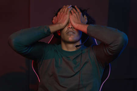 Close up portrait of the afro american guy with hands near his face on the dark background