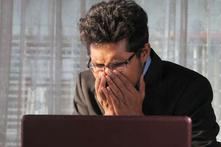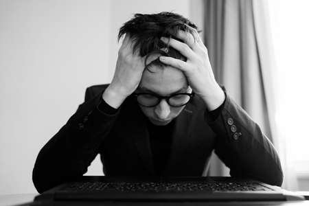 Depressed young businessman holding head in hands, has problem, a laptop on the desk. A guy made a mistake in a work