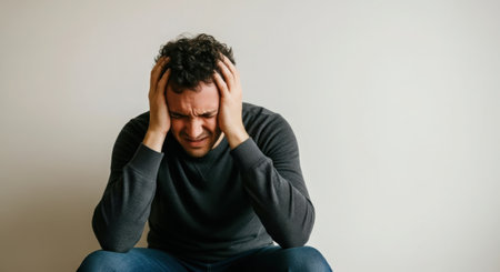 A man sits hunched over, hands gripping his head, eyes closed in apparent distress or deep thought against a plain background.