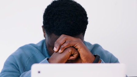 Desperate sad african american man holding head with hands looking stressed sitting at desk studio shot. Frustrated upset black guy having problem face portrait. Negative people emotion concept