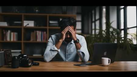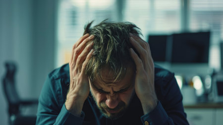 person holding his head with his hands, showing a painful expression, with modern office in the background generative ai