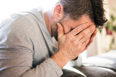 Depressed man at home on couch look sad