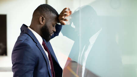 Closeup of upset black businessman leaning on glass wall