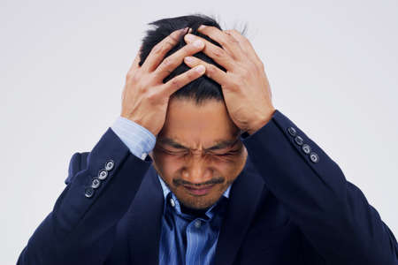 Portrait of a man with a headache on a white background.