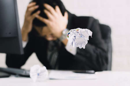 stressed young man sitting at workplace with crumpled papers and laptop