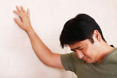 Asian miserable depressed man stay alone with sky background. Depression and mental health concept.