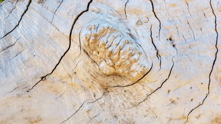 Old grey brown wood cut texture. Grunge dark background closeup. Detailed texture of a cracked section of a tree.