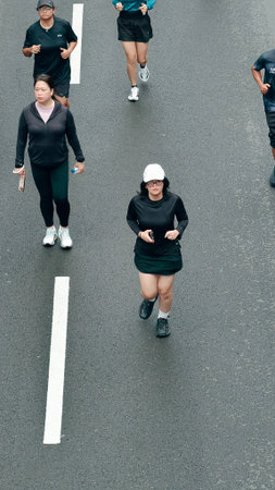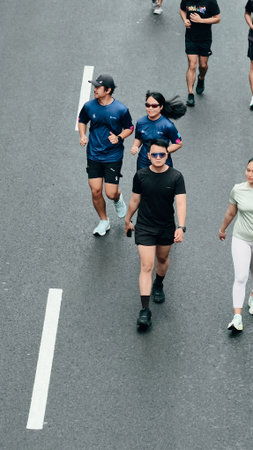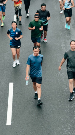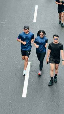 Jakarta, Indonesia - Februari 1, 2026: People running and jogging during Car Free Day event at Sudirman street, showing healthy lifestyle, urban fitness activity, and active commun