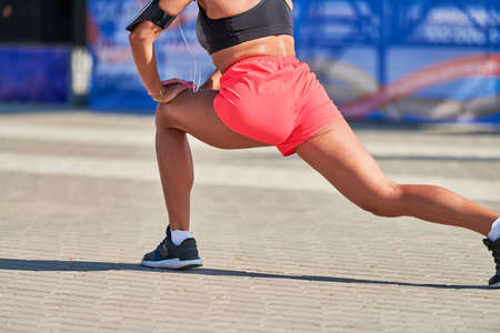 Young woman warming up before running marathon. Beautiful girl with tan legs. Outdoor fitness stretching exercise. Sport party.