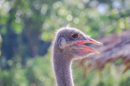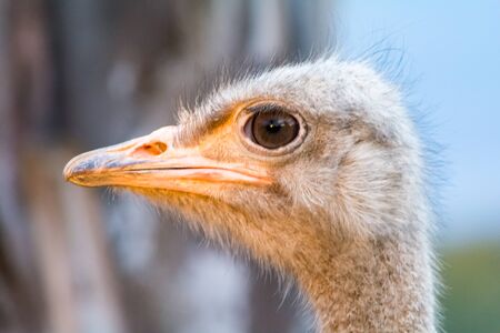 Close up of African Ostrich bird head on the blur bright background.
