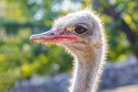 Portrait of an ostrich in the zoo. Close-up