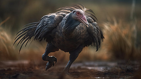 Wild turkey standing on one leg in the grass, popular bird specie from Mexico and Europe, christmas and thanksgiving animal