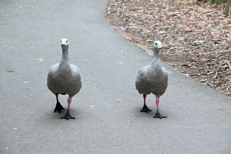 the cape barren geese are large grey geese with a yellow beak and white forhead