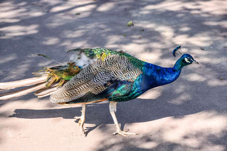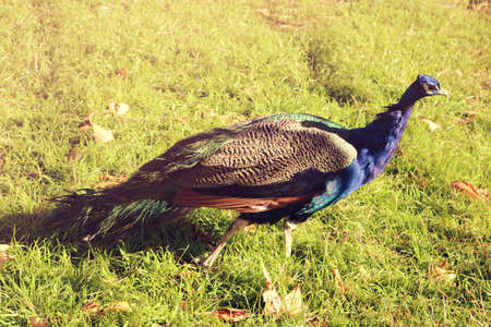 Profile of a blue peacock male walking in the park in a sunny autumn landscape