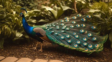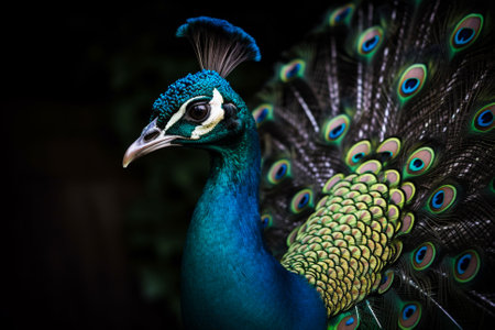Peacock's Beauty in Detail. A detailed illustration of a peacock's head and its vibrant, colorful feathers in full display. Ai generated