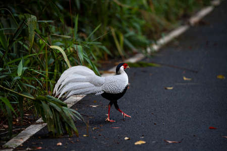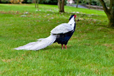 A male silver pheasant with silvery grey color , black markings on the feathers , long tail and black underparts and crest.