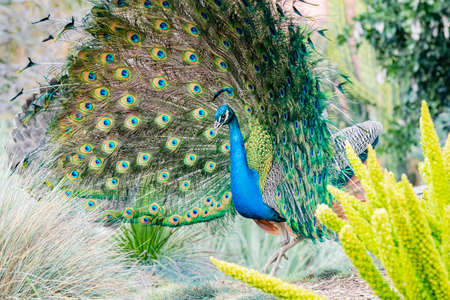 Peacock showing his lush tail full of feathers in a ZOO in Cali, Colombia