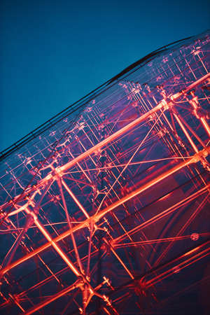 Steel structure geometry construction as the background. Structural glass facade curving roof, abstract architecture fragment copy space