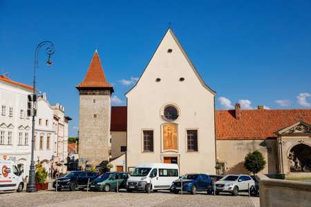 Znojmo, South Moravia, Czech Republic, 03 July 2021: Masaryk's square at sunny day, baroque and renaissance historic building, Church of St. John the Baptist and Alcove Chapel of Mount of Olives.