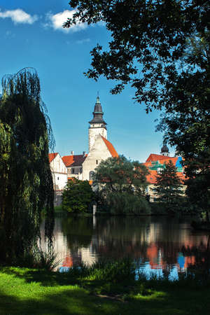 Jindrichuv Hradec view at the pond and historic buildings, Czech Republic