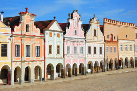 Historic square in TelÄ, a UNESCO World Heritage site in the Czech Republic. Famous for its Renaissance and Baroque houses with colorful facades, arcades, and charming atmosphere,
