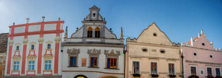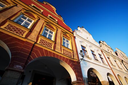 Scenic view of renaissance tenement houses on market square of old town in Nove Mesto nad Metuji, Czech Republic at sunny day