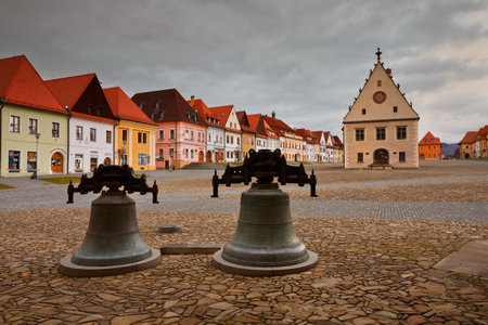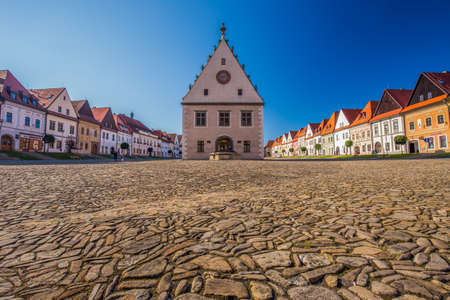 Central square surrounded by well-preserved Gothic and Renaissance houses in Bordejov, Slovakia
