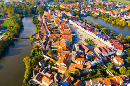 Aerial view of historical centre of small Czech town of Telc, also called Moravian Venice because of its canals on sunny autumn day