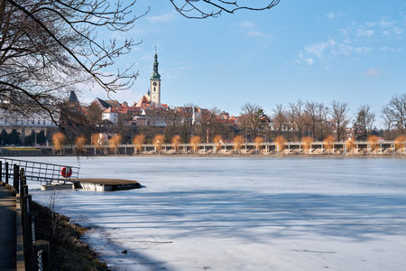 TABOR, CZECH REPUBLIC - FEBRUARY 28, 2021: Dean's Church of Lord's Conversion and other buildings behind the Jordan dam