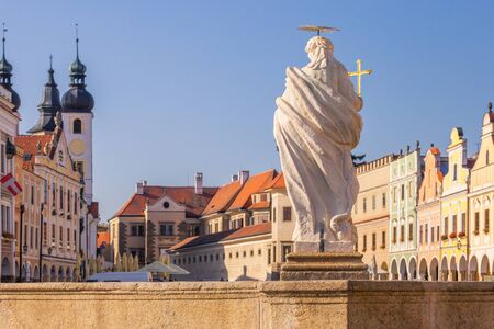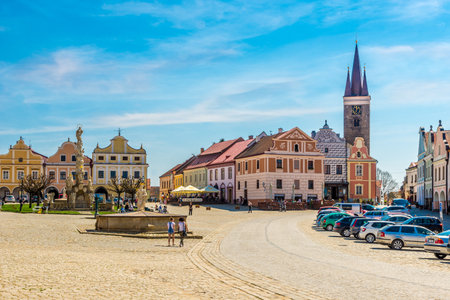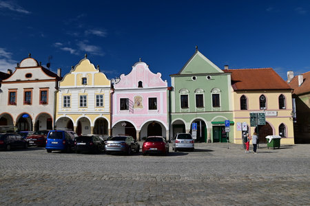 Historic square in Tel?, a UNESCO World Heritage site in the Czech Republic. Famous for its Renaissance and Baroque houses with colorful facades, arcades, and charming atmosphere,