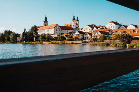Telc, Czech Republic. Beautiful sunny water reflection landscape with small town in Moravia