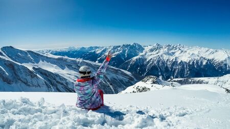 Snowboarding girl sitting on the snow in Innerkrems, Austria, enjoying the view. Lots of snow in the mountains. Endless Alp's chain in front. Winter wonderland, paradise. Perfect condition for skiing.