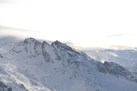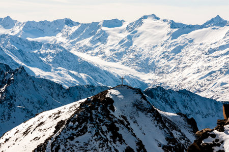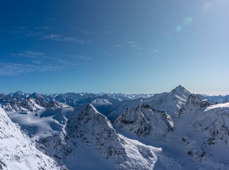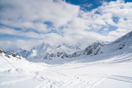 Beautiful view of the Alps mountains in sunny winter day, Austria, Stubai, Stubaier Gletscher resort
