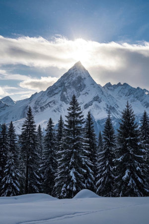 Scenic sunny landscape with sunlit coniferous trees on mountain and high snowy sharp pinnacle under cirrus clouds. Beautiful alpine scenery with forest in golden sunshine and mountain top with snow.