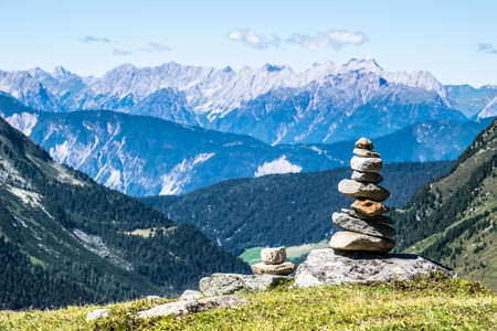 Mountain and alpine hill landscape mountains rocks and peaks panorama of Lechtal alps with snow nature and blue sky in the Alps Fliess Landeck Tyrol Austria.