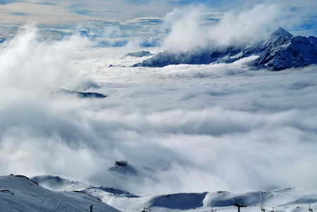 Mountain landscape with fog and clouds. Caucasus Mountains, Georgia.