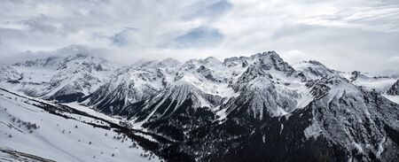 Panorama of snowy Caucasus mountains in Karachayevo-Circassian Republic, Russia at winter day