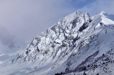 High mountains under snow in the winter. A series of photos of the Caucasus Mountains, ski resort Dombay, Karachay-Cherkessia