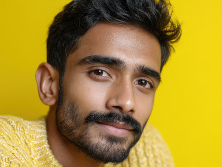 Young man with dark hair and beard in yellow knit sweater, close-up, with soft smile on his face, against yellow background. Warm and inviting expression, well-defined features