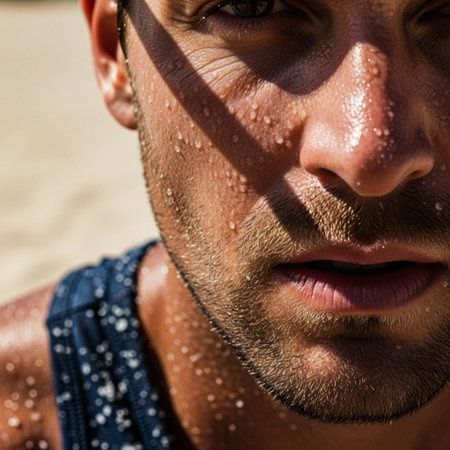 Extreme macro detail of a sweaty beach volleyball player's face and visible pores under harsh sunlig
