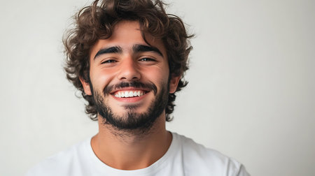 A confident young man with curly hair poses in a casual white shirt against a neutral backdrop, showcasing a warm and approachable expression.
