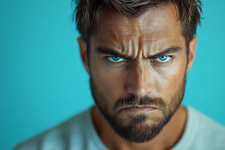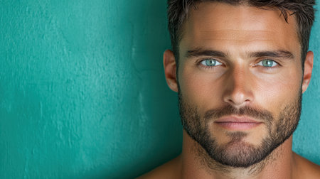 A Confident man with striking blue eyes and beard against green background