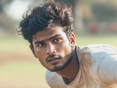 Portrait of a focused and determined young Indian male athlete showcasing his cricket skills and passion for the sport in an outdoor field setting The image captures the athleticism energy
