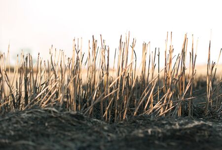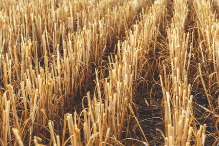 Dry straw in the field after harvest, at sunset. Background or texture.